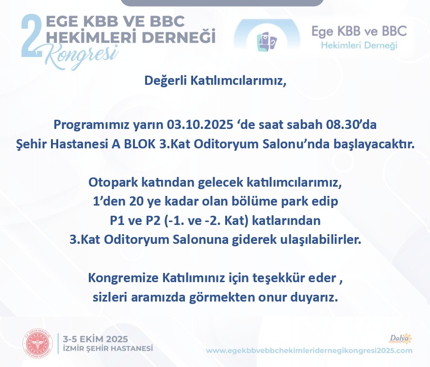 Geçtiğimiz yıl ilkini büyük bir ilgi ve coşkuyla gerçekleştirdiğimiz Ege KBB ve BBC Hekimleri Derneği Kongresi’nin bu yıl ikincisini düzenlemenin mutluluğu ve heyecanı içerisindeyiz. 2. Ege KBB ve BBC Hekimleri Derneği Kongresi, 3–5 Ekim 2025 tarihleri arasında İzmir Şehir Hastanesi ev sahipliğinde gerçekleştirilecektir.